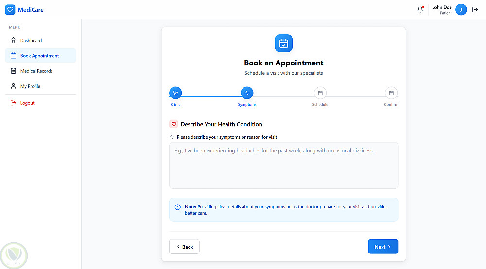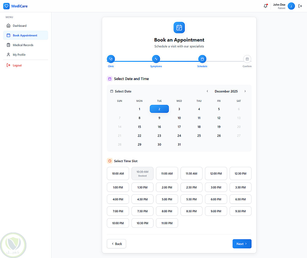 بعد ما الدكتور يخلص الكشف، بيحدد للمريض موعد الزيارة اللي بعدها، والمريض بيقدر يشوفها من حسابه ويعرف هو راجع امتى من غير ما يسأل أو يدوّر.