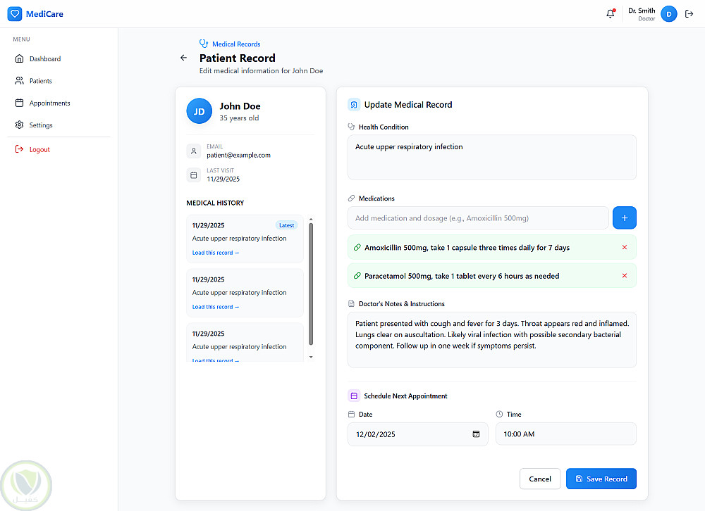الدكتور بيكتب العلاج من جوه السيستم، والمريض يقدر يشوف الروشتة في أي وقت من حسابه من غير ما يعتمد على الورق.
