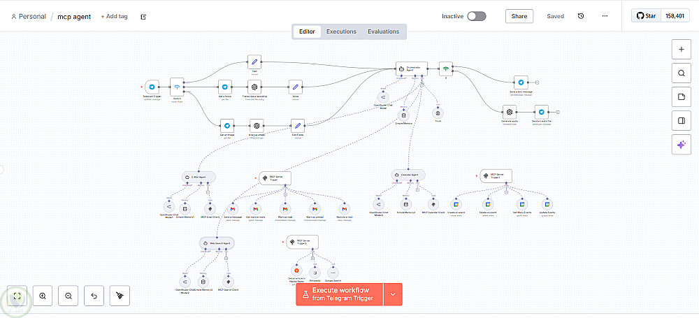 ده نظام ذكي متكامل معمول على n8n، بيستقبل كل أنواع الرسائل من تيليجرام أو سيرفرات MCP سواء نص، صوت، صورة أو فيديو. السيستم بيحلل المحتوى، ويا إمّا يحوّله لنص (لو صوت أو فيديو) أو يحلّل الصورة وبعدين يبعتها للوكيل الأساسي "Orchestrator Agent" اللي بيحدد يرد إزاي.