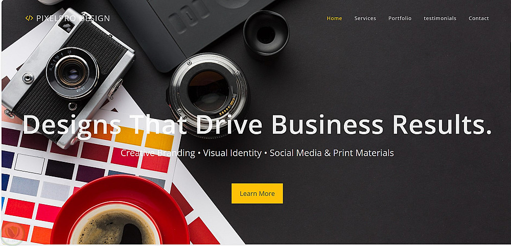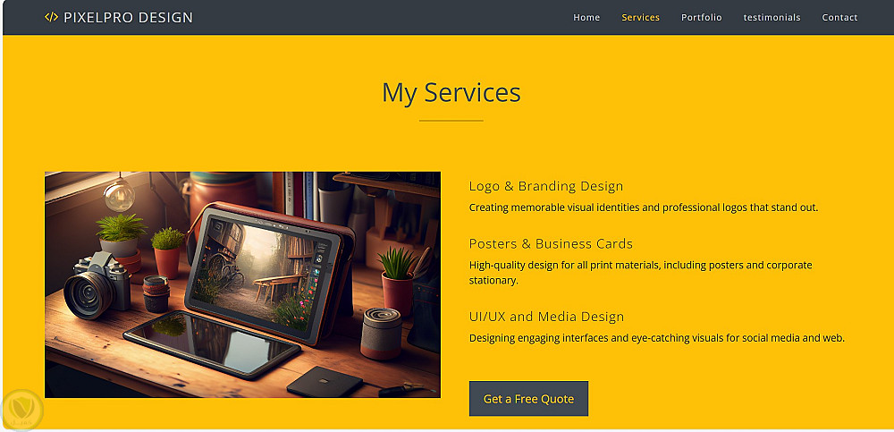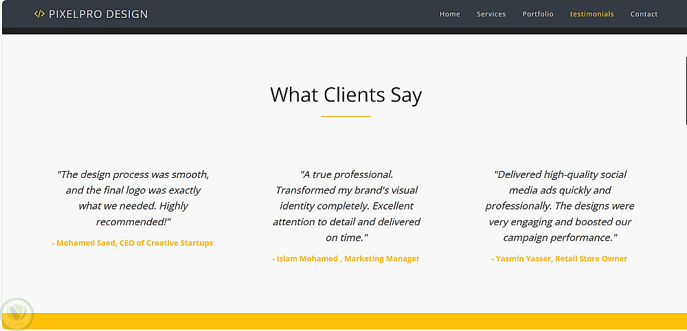 القيمة المضافة,"* هوية لونية مُحكمة: استخدام تركيبة اللون الأصفر الكلاسيكية مع الخلفيات الداكنة لتركيز الانتباه على الأعمال. * إعادة هيكلة المحتوى: تنظيم الخدمات والمشاريع الستة الرئيسية بشكل منطقي وسهل التصفح. * تعزيز المصداقية: دمج قسم ""آراء العملاء"" في مكان بارز لزيادة الثقة. * كود نظيف: تم بناء الواجهة بأكواد HTML و CSS نظيفة وخالية من الإضافات غير الضرورية (مثل فلاتر المشاريع)."