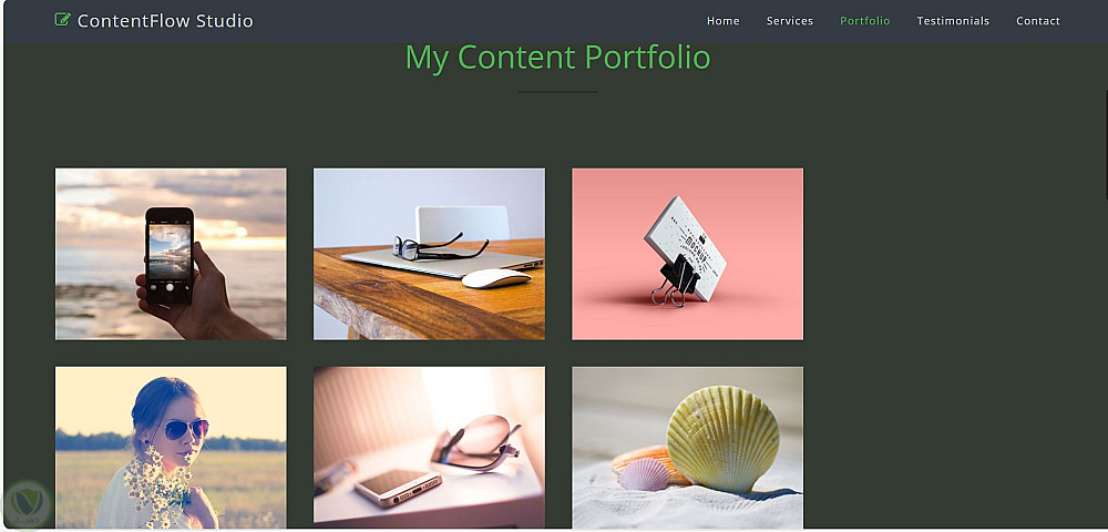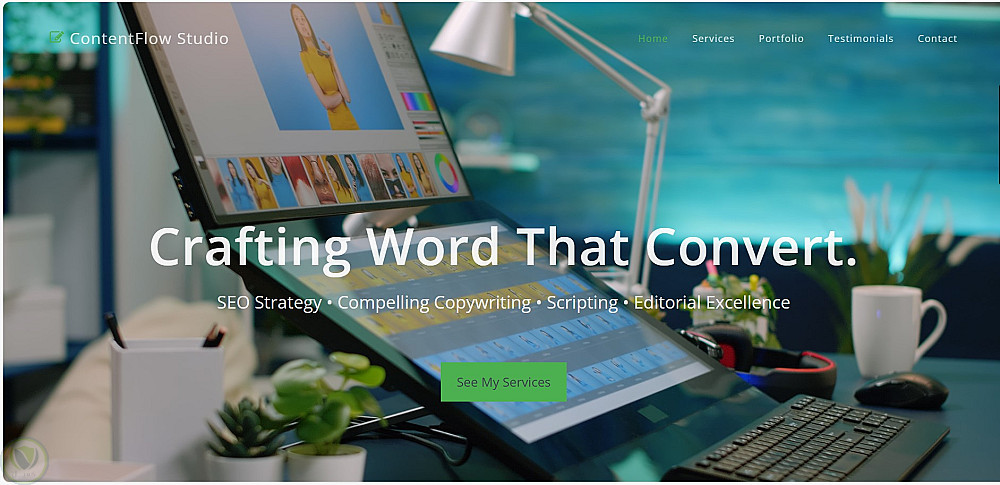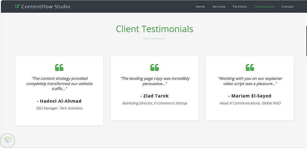 التحدي,"إنشاء صفحة بورتفوليو تركز على المصداقية والخدمات الكتابية (SEO, Copywriting)، مع تطبيق نظام ألوان هادئ ومهني (أخضر/رمادي فاتح)."