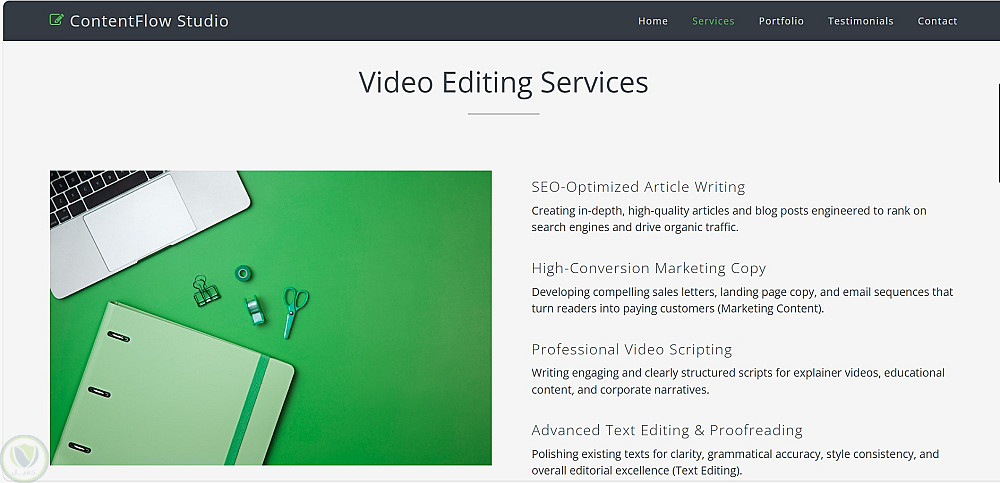 الحل المخصص,* تعديل الـ CSS: تطبيق اللون الأخضر (#4CAF50) ليعطي شعوراً بالثقة والنمو. * تخصيص الـ HTML: إعادة هيكلة قسم الخدمات ليشمل (كتابة الـ SEO، نصوص إعلانية، سكريبت فيديو)، وإضافة قسم Testimonials مُركّز على نتائج الكتابة. * تحسين التخطيط: تعديل التنسيق لضمان ظهور زر CTA في قسم الخدمات بشكل صحيح ومهني.