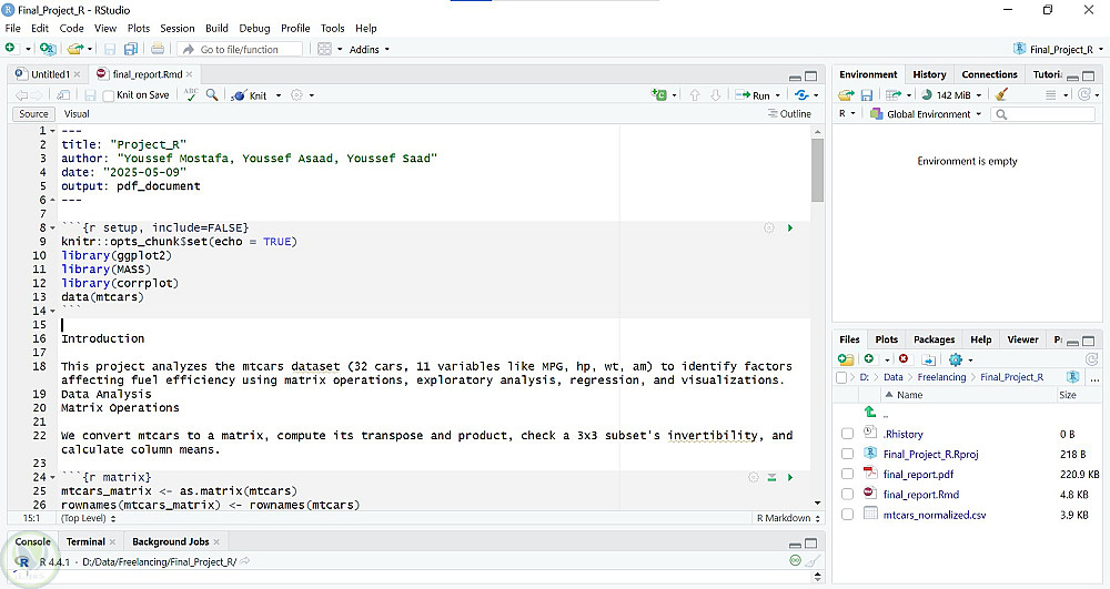 قدّم هذا المشروع تحليلًا شاملًا لبيانات mtcars التي تضم 32 سيارة و11 متغيرًا يتعلق بالأداء مثل كفاءة استهلاك الوقود (MPG)، القدرة الحصانية، الوزن، ونوع ناقل الحركة. يهدف التحليل إلى تحديد العوامل الأكثر تأثيرًا على كفاءة الوقود باستخدام العمليات المصفوفية، والتحليل الاستكشافي للبيانات (EDA)، وتقنيات الانحدار، إلى جانب إنشاء تصوّرات بيانية واضحة تساعد في استخراج رؤى دقيقة واتخاذ قرارات مبنية على البيانات.