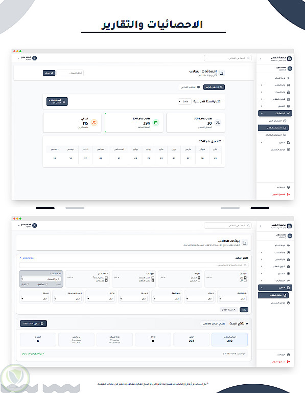 عرض تقارير وإحصائيات بيانية لحظية لتوزيع الطلاب (حسب الجنس، الديانة، الكلية، ...).