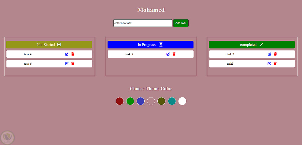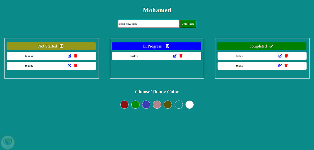 تطبيق ويب ذكي يتيح لك تنظيم مهامك اليومية عبر ثلاث مراحل واضحة (لم تبدأ، قيد التنفيذ، ومكتملة). يساعدك التطبيق على مراقبة تقدمك بدقة بدلاً من مجرد كتابة المهام، مع ميزة فريدة لتغيير ألوان الواجهة بالكامل لتناسب ذوقك الشخصي.