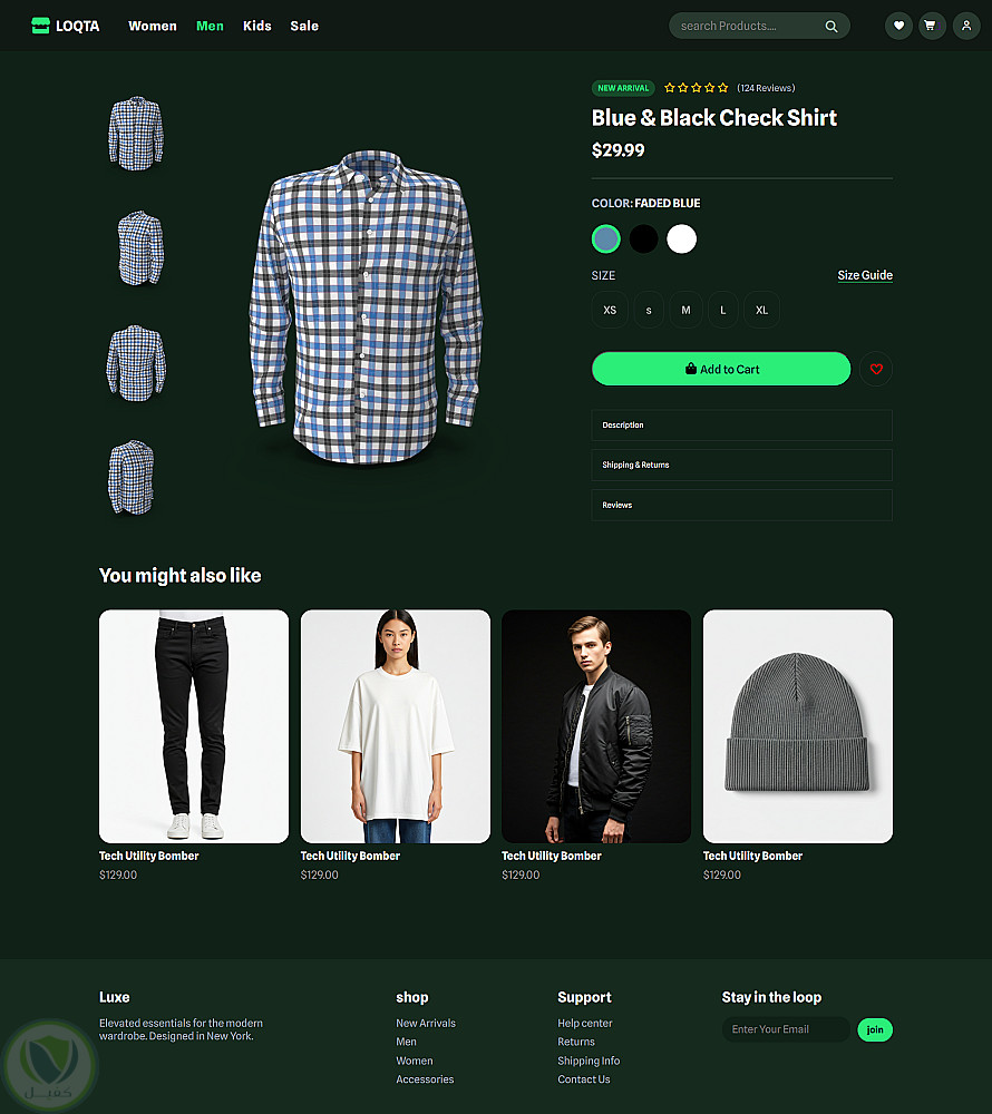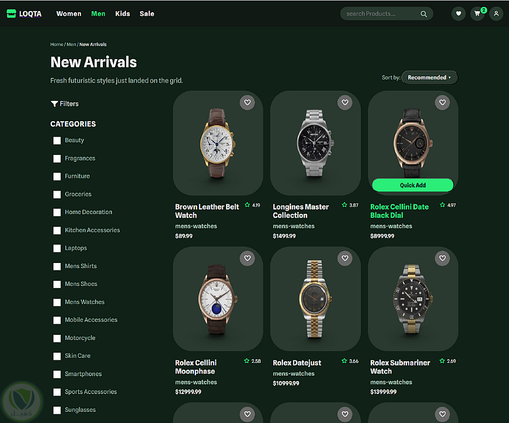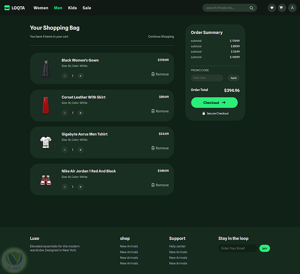 تطبيق ويب لمتجر إلكتروني متخصص في الملابس والإكسسوارات، يركز على تقديم واجهة مستخدم (UI) عصرية بنظام الـ Dark Mode. المشروع يغطي كافة مراحل رحلة العميل؛ من تصفح المنتجات، الفلترة حسب الفئة، وحتى إدارة سلة التسوق وإتمام عملية الطلب.