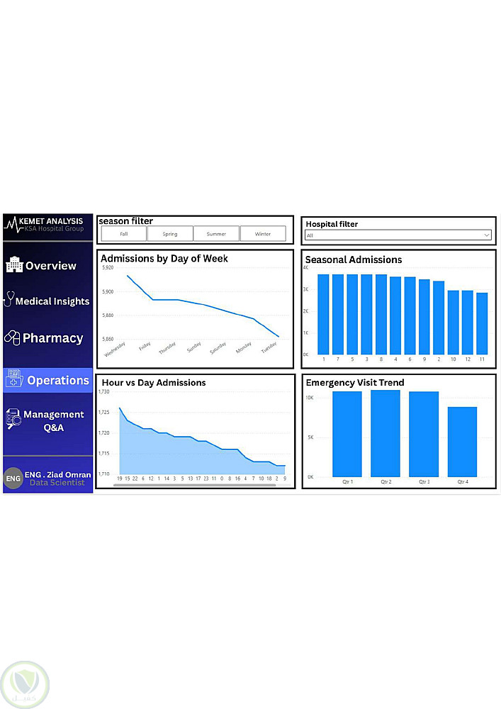 الداشبورد يعرض مؤشرات أداء رئيسية (KPIs) مثل إجمالي حالات الدخول، الطوارئ، وإعادة الدخول، مع فلاتر تفاعلية لتحليل أوقات الذروة، أكثر الأمراض شيوعًا، وتوزيع المرضى.