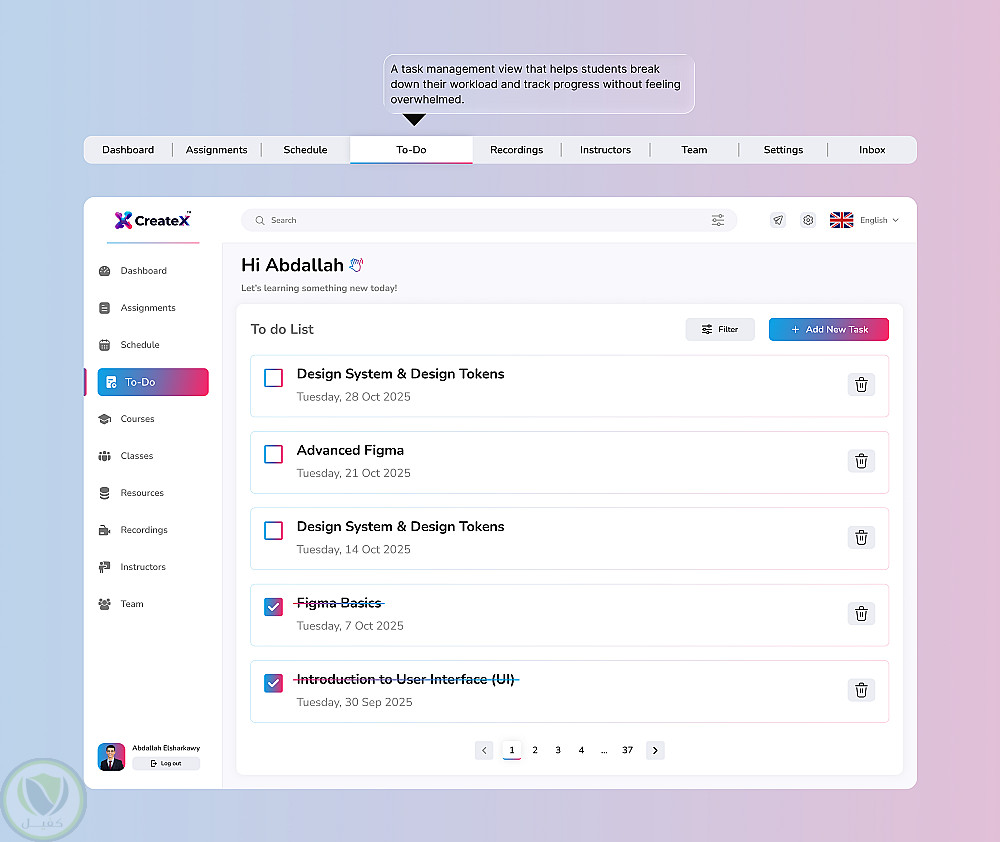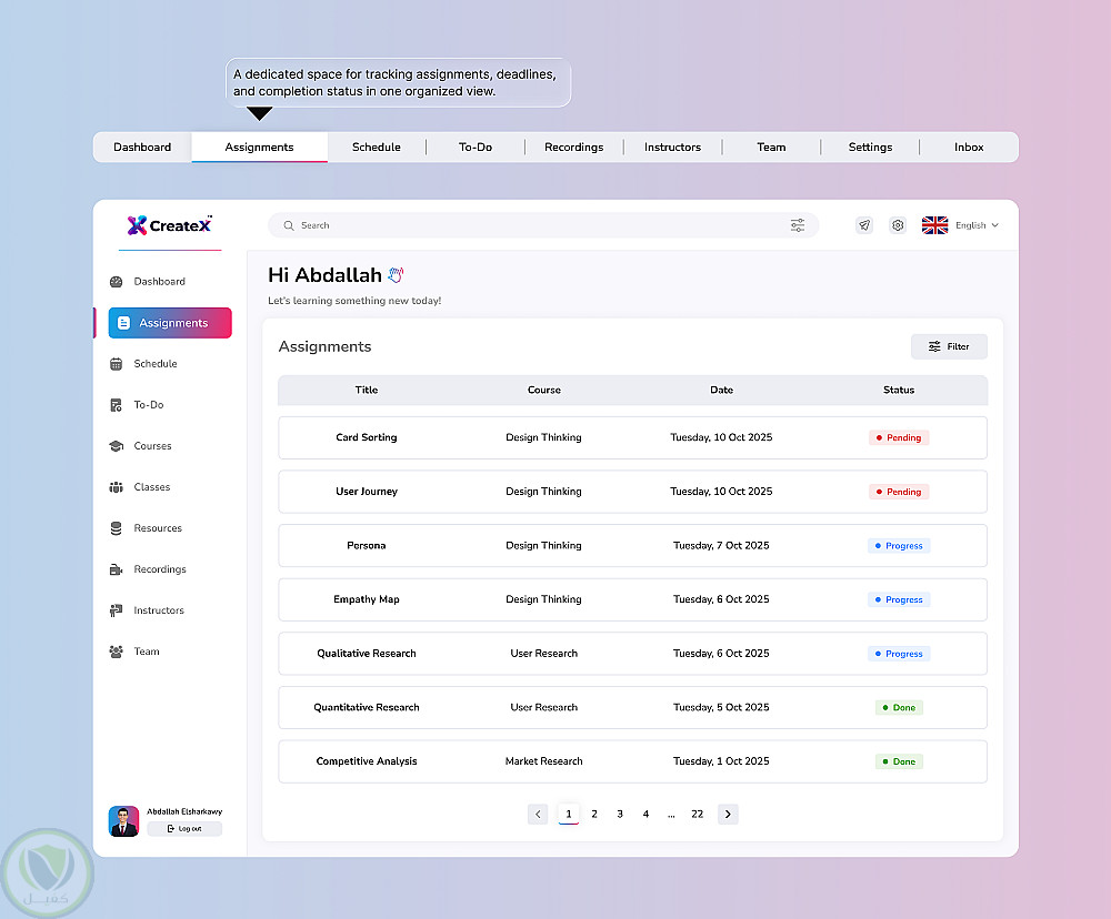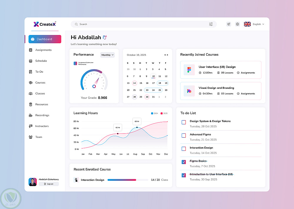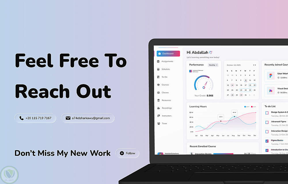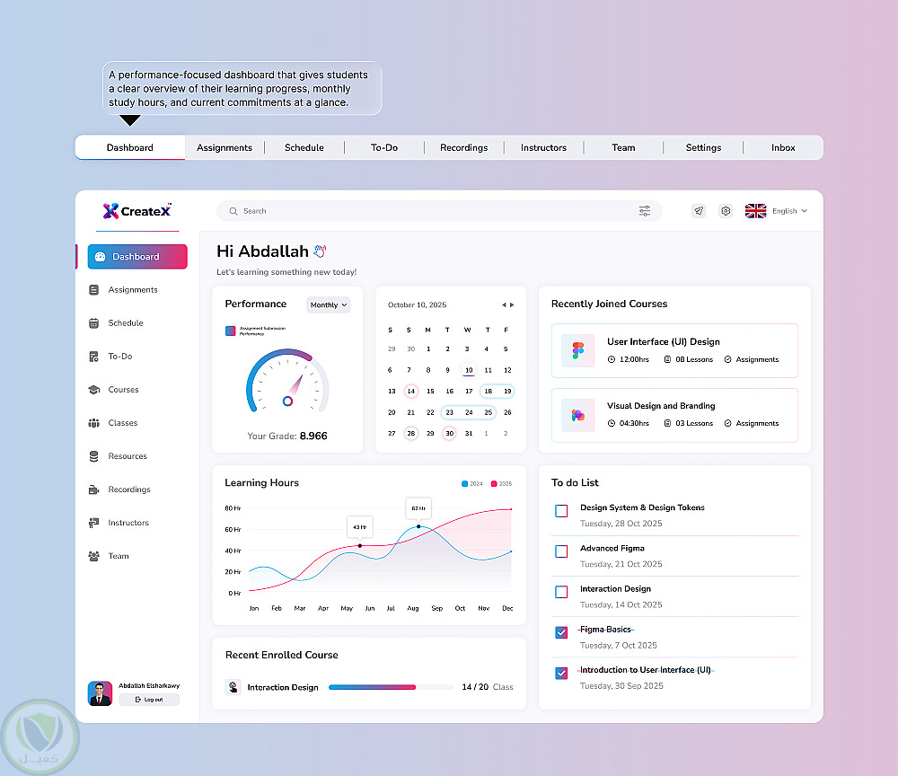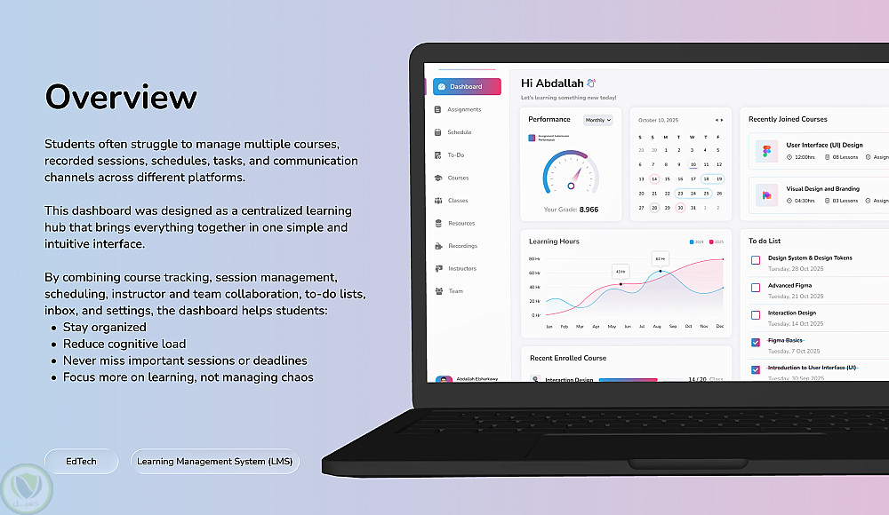 تصميم لوحة تحكم للطالب مخصصة لمنصات التعليم والكورسات الأونلاين، تهدف إلى مساعدة الطالب على متابعة رحلته التعليمية بسهولة ووضوح من خلال واجهة مستخدم حديثة وتجربة استخدام بسيطة.