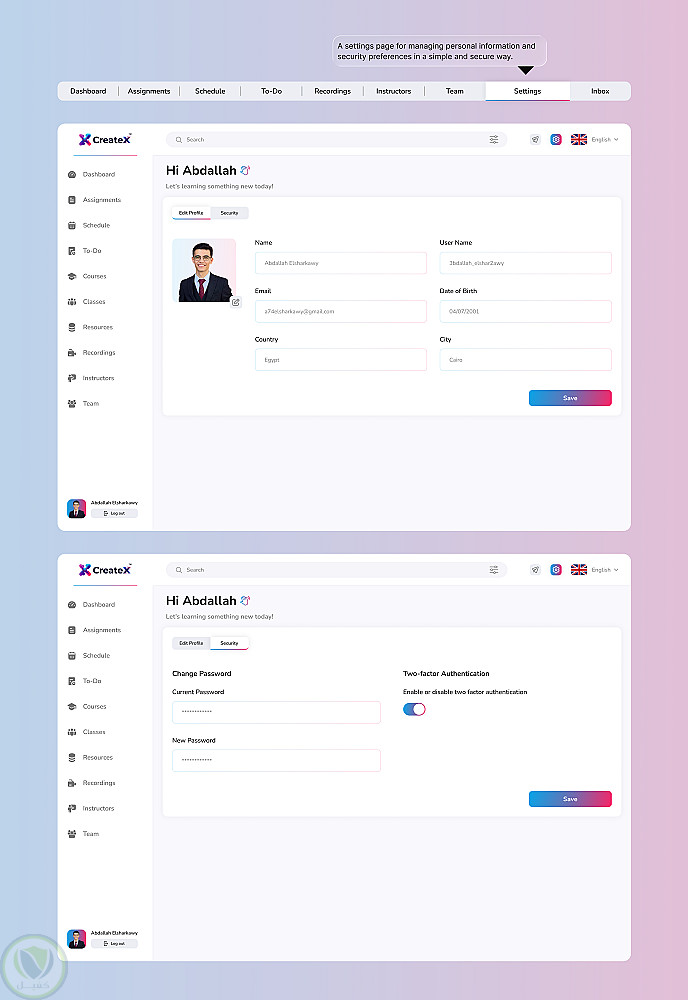 - صفحة إعدادات لتعديل البيانات والتحكم في الأمان