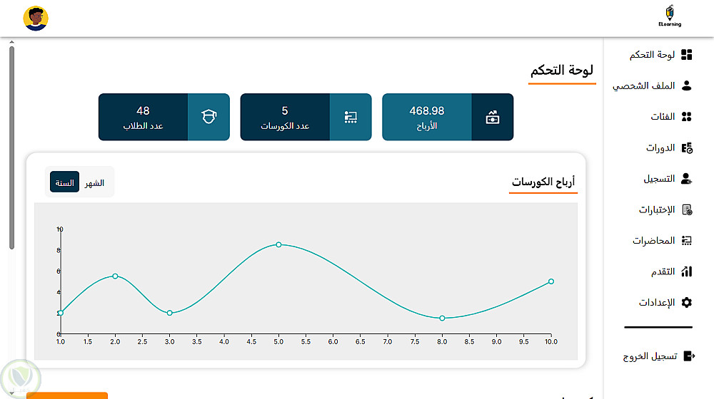 إدارة الدورة التعليمية: نظام متكامل يتيح للمدربين إدارة الكورسات والطلاب، وللطلاب إمكانية البحث المتقدم وإدارة ملفاتهم الشخصية بسهولة.