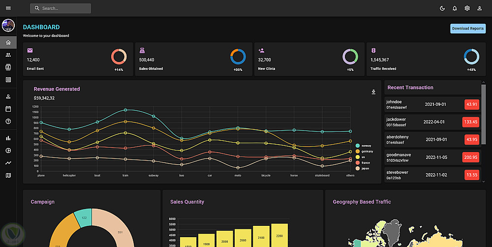 هذا المشروع عبارة عن لوحة تحكم إدارية شاملة مصممة لتزويد مديري الأعمال أو المسؤولين برؤية مركزية ومباشرة لأداء مشاريعهم أو شركاتهم. يتميز بواجهة مستخدم منظمة جيدًا مع شريط جانبي للتنقل السريع بين الأقسام الرئيسية مثل "الفريق" و"جهات الاتصال" و"الفواتير"، بالإضافة إلى لوحة تحكم رئيسية تعرض مؤشرات الأداء الرئيسية (KPIs) مثل عدد رسائل البريد الإلكتروني المرسلة والمبيعات والعملاء الجدد وحركة مرور الموقع الإلكتروني. كما يوفر المشروع العديد من الرسوم البيانية (المخطط الشريطي، والمخطط الدائري، والمخطط الخطي، والمخطط الجغرافي) ويعرض العمليات والحملات التسويقية الأخيرة، مما يسهل اتخاذ القرارات بناءً على البيانات.
