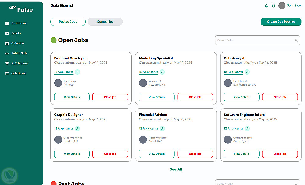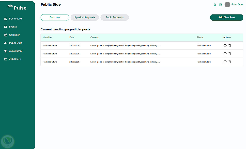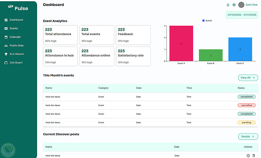 لوحة تحكم إدارية متكاملة لإدارة وتشغيل منصة ALX Pulse بكفاءة عالية، تُمكّن فرق الإدارة من التحكم الكامل في الفعاليات، المبادرات، الوظائف، الشراكات، المحتوى العام، وبيانات الأعضاء من خلال نظام مركزي موحّد. استهدف المشروع حل مشكلة تعدد الأدوات وصعوبة إدارة كميات كبيرة من البيانات، عبر Dashboard موثوقة، مرنة، وسهلة الاستخدام تدعم التحليل واتخاذ القرار.