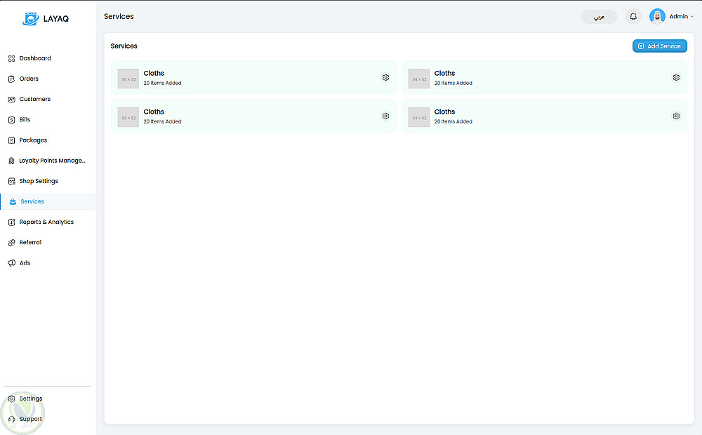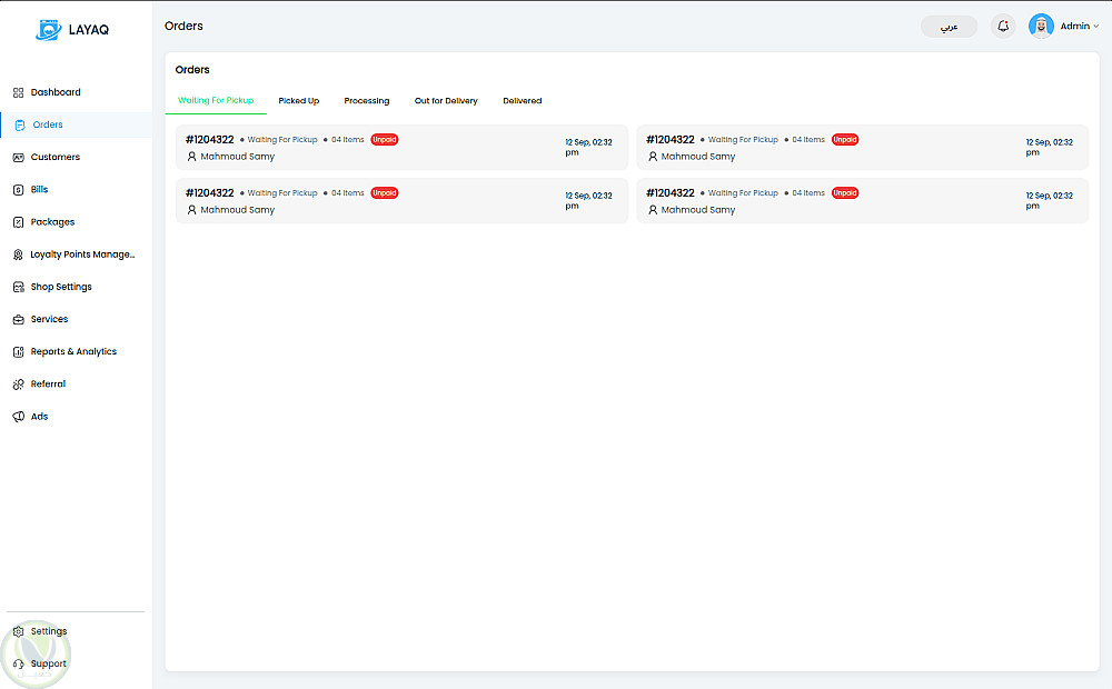 تطبيق ادارة مغسلة مع لوحة تحكم كاملة