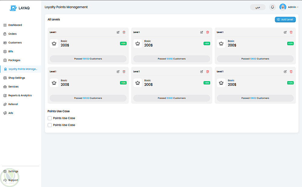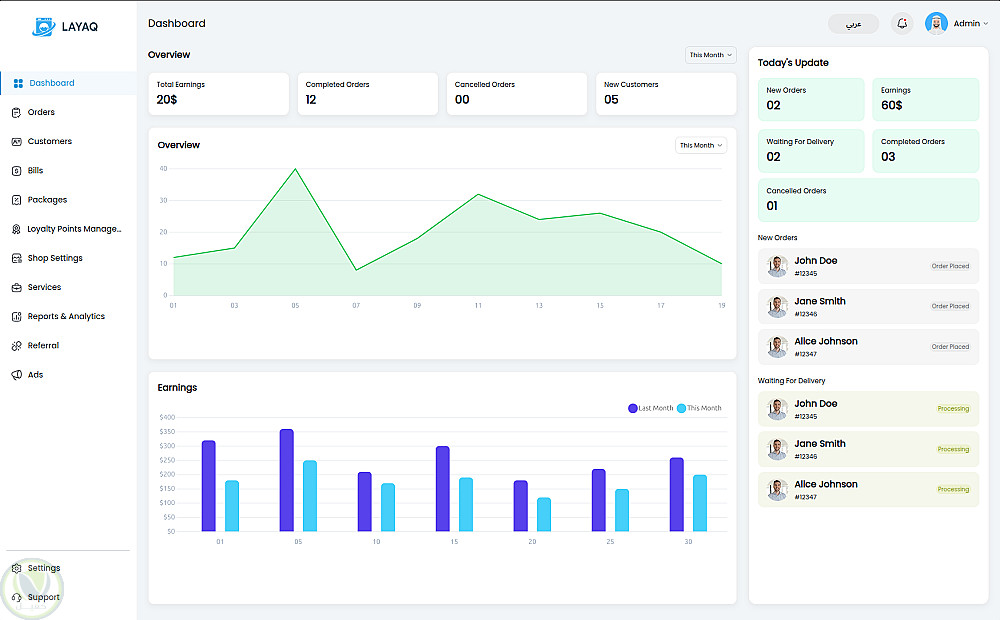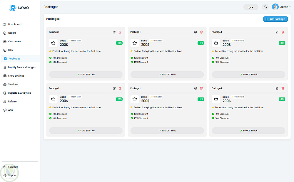 توفّر المنصة لوحة تحكم ذكية بإحصائيات فورية ورسوم بيانية تفاعلية، نظامًا متكاملًا لإدارة دورة حياة الطلبات، إدارة احترافية للعملاء ونقاط الولاء، فواتير وتقارير مالية دقيقة، وباقات مدفوعة مسبقًا مع برنامج ولاء متعدد المستويات. كما تشمل نظام خدمات مرن، تقارير وتحليلات متقدمة، إحالات، إعلانات داخل النظام، صلاحيات متعددة، ودعم فني متكامل.