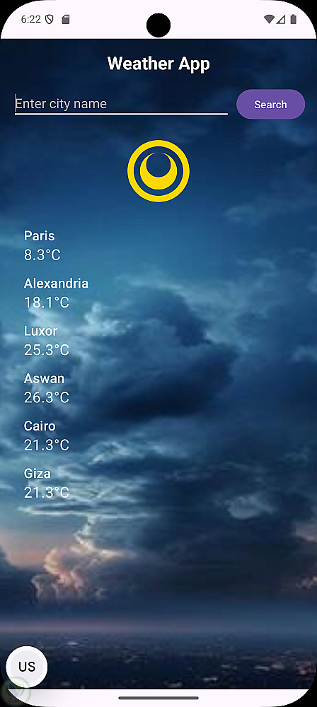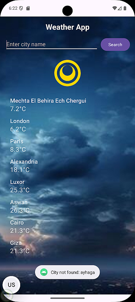 يتيح التطبيق جلب بيانات الطقس مثل درجة الحرارة والحالة الجوية الحالية، مع معالجة البيانات بصيغة JSON وعرضها في واجهة مستخدم واضحة وسهلة الفهم.