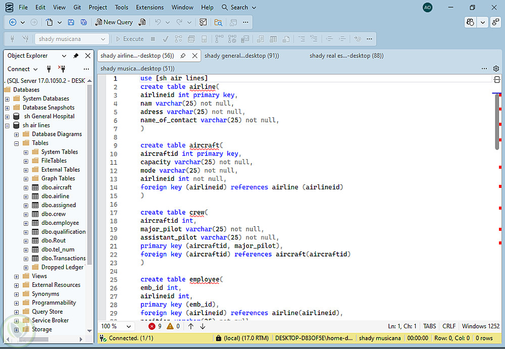 تصميم وبناء مخطط قاعدة بيانات (Schema) متكامل لنظام إدارة شركات طيران باستخدام SQL Server. يهدف المشروع لتحويل العمليات التشغيلية المعقدة (إدارة أسطول، جدولة، مالية) إلى نموذج علائقي كفء.