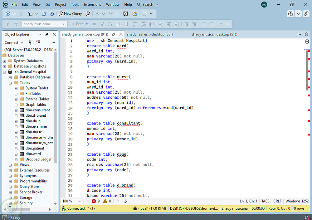 تصميم وبناء قاعدة (SQL Server) وانشاء لمخطط الـ ERD (الرسم التخطيطي للجداول والعلاقات) لنظام إدارة مستشفى متكامل