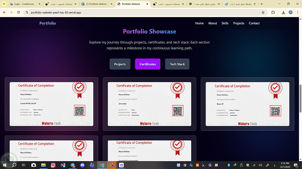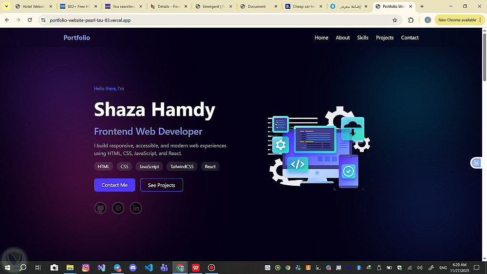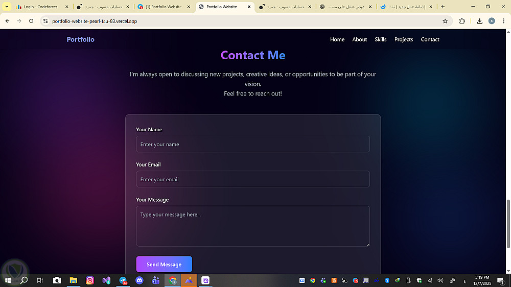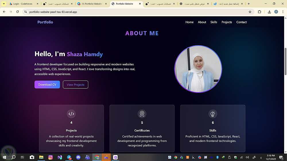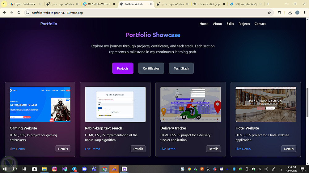 تم تصميم وبناء موقع Portfolio شخصي باستخدام HTML، CSS، JavaScript وTailwind CSS لعرض المهارات والمشاريع بشكل احترافي وجذاب. الموقع متجاوب تمامًا مع جميع الأجهزة (Responsive Design) ويحتوي على: