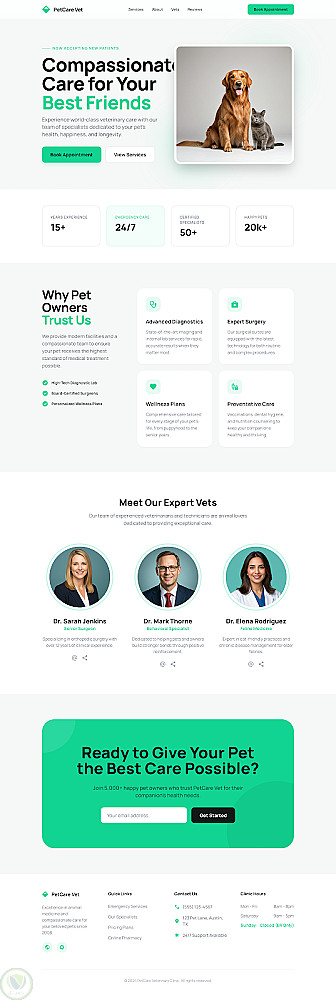 هذا المشروع هو تصميم موقع ويب كامل وجاهز للنشر لعيادة بيطرية حديثة تسمى "PetCare Vet". يتميز بتصميم شامل في صفحة واحدة يتضمن جميع الأقسام الأساسية التي تحتاجها أي عيادة بيطرية محترفة لجذب العملاء وعرض خدماتها وبناء الثقة. التصميم نظيف واحترافي وسهل الاستخدام، مما يعكس مستوى عالٍ من الرعاية.