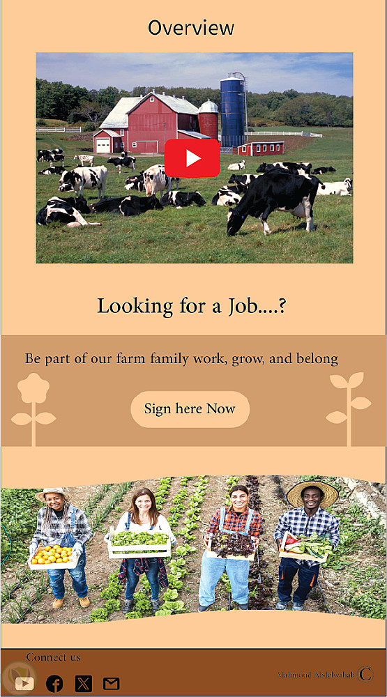 الأقسام الرئيسية: واجهة جذابة: قسم علوي برسالة تسويقية واضحة وزر اتخاذ إجراء. العروض: عرض منظم للمنتجات والأسعار. التوظيف والموقع: تعريف بالمزرعة وموقعها مع بوابة مخصصة لفرص العمل.