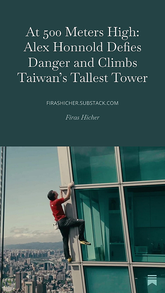 مقال إخباري بعنوان «على ارتفاع 500 متر: أليكس هونولد يتحدى الخطر ويتسلق أعلى برج في تايوان»
