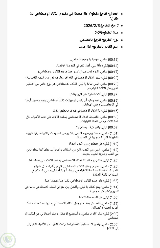 تفريغ نصي لفيديو تعليمي - موضوع الذكاء الاصطناعي للأطفال.