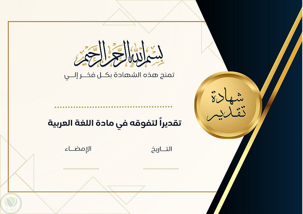 تصميم لشهادة تقدير لمادة اللغة العربية بتصميم بسيط