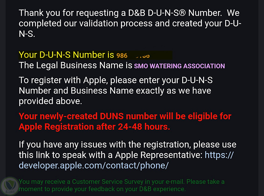 نجاح استخراج الرقم (D-U-N-S) في وقت قياسي واستلام رسالة التأكيد الرسمية، مما مكّن الشركة من استكمال تأسيس بنيتها التحتية الرقمية (مثل حسابات Apple Developer وتوثيق Meta Business Manager) بكل أمان وموثوقية، وتفادي أي قيود مستقبلية.