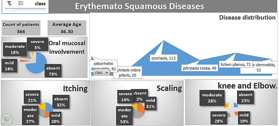 لوحة بيانات تفاعلية لبيانات مجموعة من الامراض الجلدية بهدف البحث والدراسة تم الحصول على البيانات من كاجل وتم تنفيذه باستخدام الاكسيل