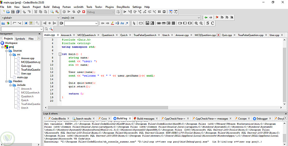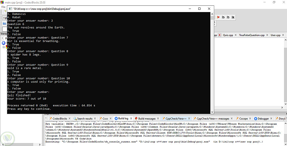 هذا المشروع هو لعبة اختبار (Quiz) تُشغّل من خلال وحدة التحكم (Console) وتم تطويرها باستخدام مبادئ البرمجة الكائنية التوجه (OOP) في لغة ++C. يتيح النظام للمستخدم إدخال اسمه، وأداء اختبار مكوّن من 10 أسئلة (5 أسئلة اختيار من متعدد و5 أسئلة صح أو خطأ)، ثم يحصل على الدرجة النهائية في النهاية.