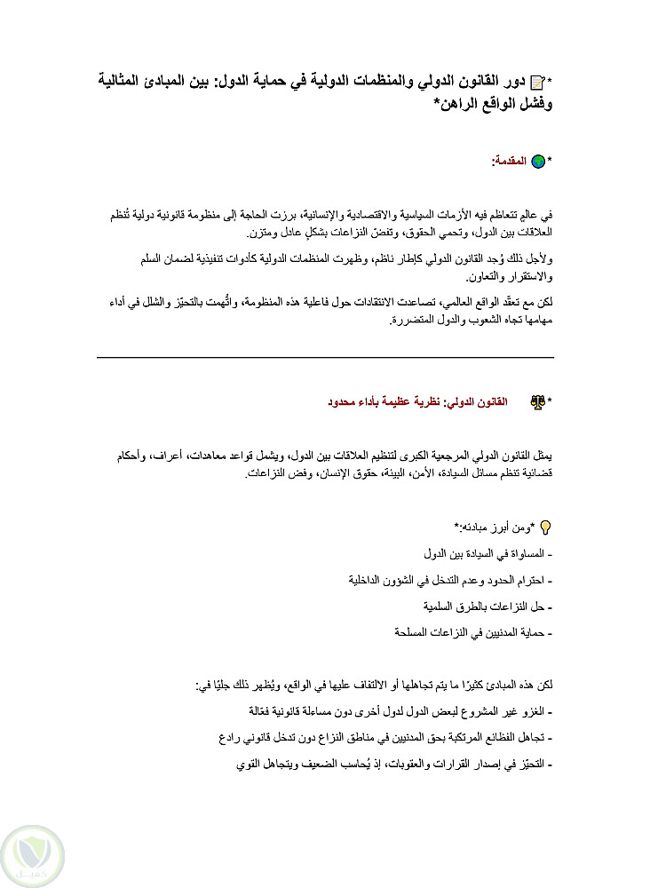 مقال بعنوان دور القانون الدولي والمنظمات الدولية في حماية الدول: بين المبادئ المثالية وفشل الواقع الراهن