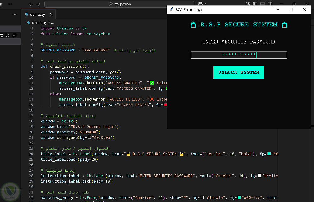 هذا المشروع عبارة عن برنامج بسيط بلغة Python يسمح للمستخدم بإدخال رقم سري (كود)، ويتحقق إذا ما كان يطابق الرقم السري المخزن مسبقًا داخل النظام. في حال التطابق، يعرض البرنامج رسالة ترحيب أو نجاح، وإذا كان الرقم خاطئًا، يظهر تنبيه بعدد المحاولات المتبقية أو يُنهي البرنامج بعد عدد محدد من المحاولات. يمكن تطوير البرنامج لاحقًا بإضافة قاعدة بيانات صغيرة أو تشفير الرقم السري لحماية أفضل.