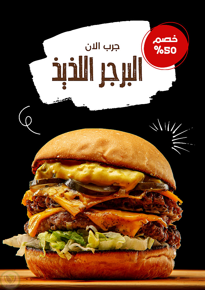 "تصميم بوستر دعائي جذاب لمطعم برجر، يعلن عن خصم %50 على الوجبات.