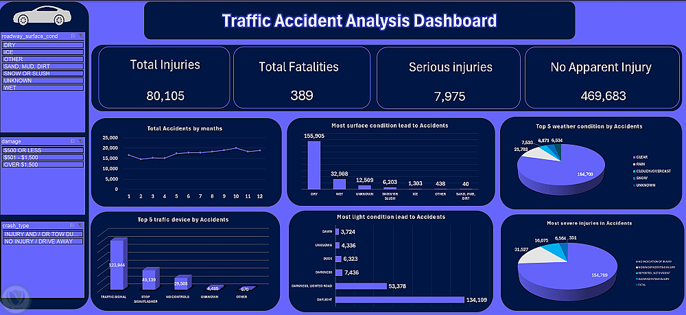 قمت بالعمل على بيانات خاصة بحوادث المرور، حيث بدأت بعملية تنظيف ومعالجة البيانات باستخدام Python لضمان جودتها والتخلص من الأخطاء والتكرارات. بعد ذلك أنشأت لوحة معلومات (Dashboard) باستخدام Excel توضح أهم المؤشرات مثل: إجمالي الإصابات، الإصابات الخطيرة، وعدد الوفيات، توزيع الحوادث حسب الأشهر، تأثير حالة الطريق (جاف، مبتل، جليد، .....) على عدد الحوادث، أكثر ظروف الطقس والإنارة المسببة للحوادث، وأكثر الأجهزة المرورية (إشارات المرور، إشارات التوقف، ....) المرتبطة بالحوادث.