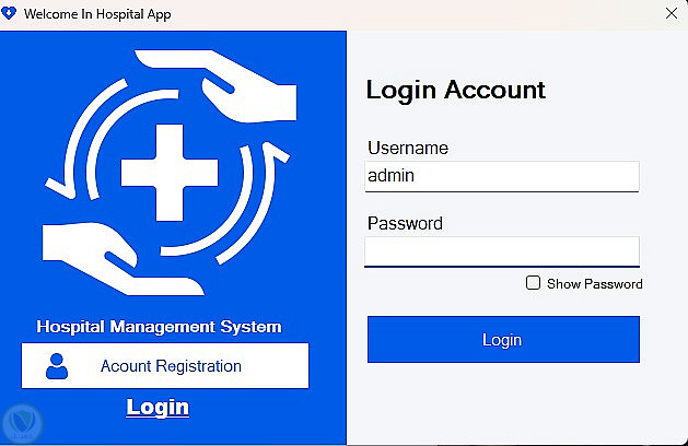 برنامج لإدارة المستشفى، بيبدأ من صفحة تسجيل دخول فيها يوزرنيم وباسورد مع اختيار إنك تظهر الباسورد أو تخفيه. كمان فيه إمكانية تعمل حساب جديد (Register).