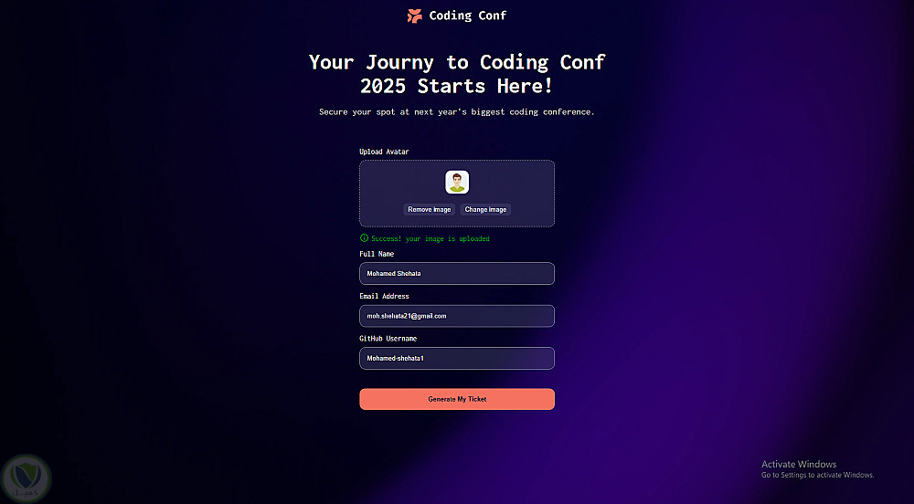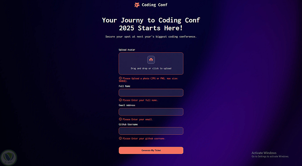 مشروع Front-End تم بناؤه باستخدام React و Tailwind CSS بهدف إنشاء أداة لتوليد تذاكر مؤتمر بشكل تفاعلي وسهل الاستخدام وهو حل لتحدي من موقع frontendmentor.io.