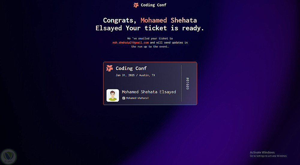 - معاينة التذكرة: عند إكمال النموذج بنجاح يتم عرض تذكرة المؤتمر التي تم إنشاؤها.