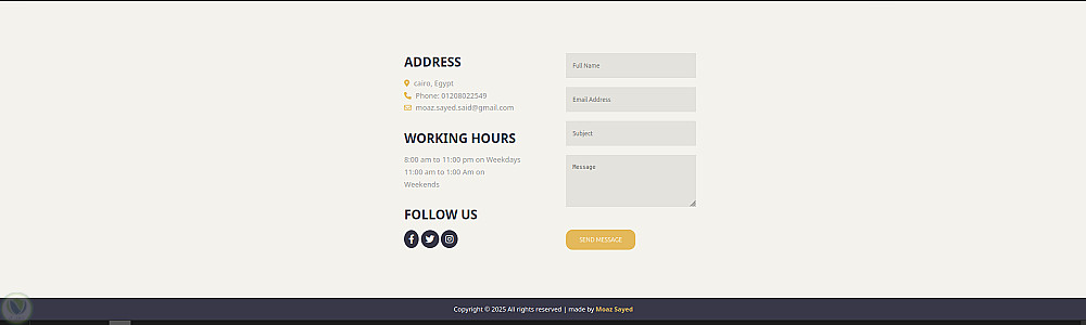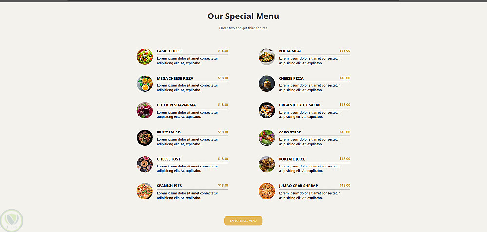 قمت بتصميم وتطوير صفحة هبوط (Landing Page) مخصصة لمطعم بهدف عرض قائمة الأكلات وجذب الزوار لطلب الطعام أو الحجز بسهولة.
