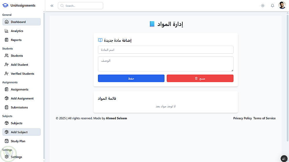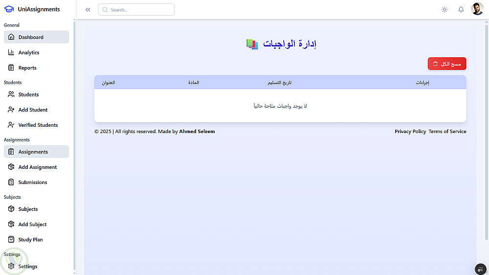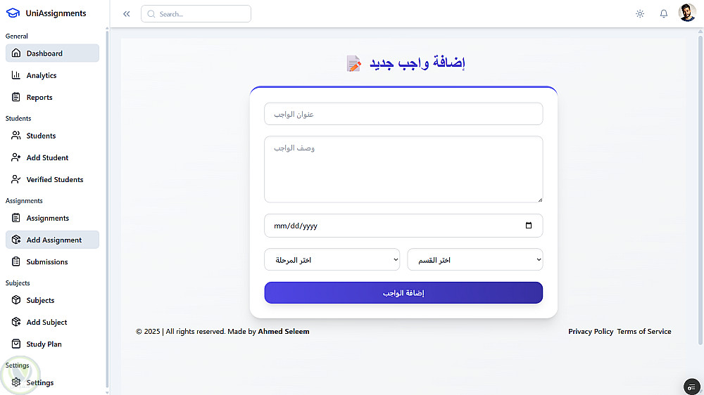 مشروع متكامل لإدارة العمليات الأكاديمية بكفاءة، يجمع بين واجهات حديثة وخصائص أتمتة قوية لتسهيل العمل على الطلاب، الأساتذة، والإدارة.