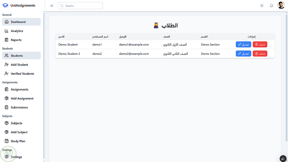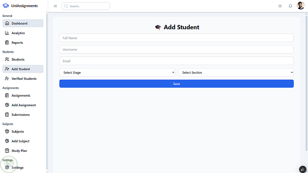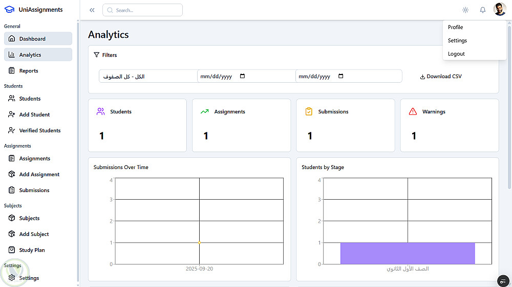 يساعد الطلاب على متابعة حياتهم الأكاديمية بسهولة، ويدعم الأساتذة في إدارة المقررات والدرجات بكفاءة، ويتيح للإدارة تقارير دقيقة وتحسين سير العمل.
