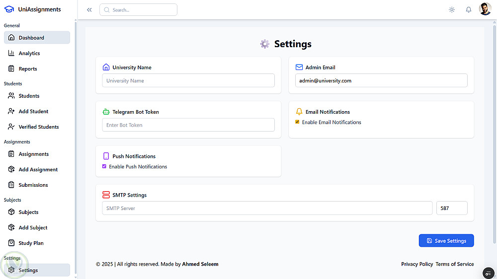 إشعارات ذكية: تنبيهات عبر Telegram والبريد الإلكتروني لتحديثات الجامعة والمواعيد المهمة.