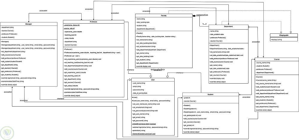 -الطلاب (Student): يحتفظ الطالب بالمقررات المسجلة، الدرجات، ودوال تسجيل الدخول.