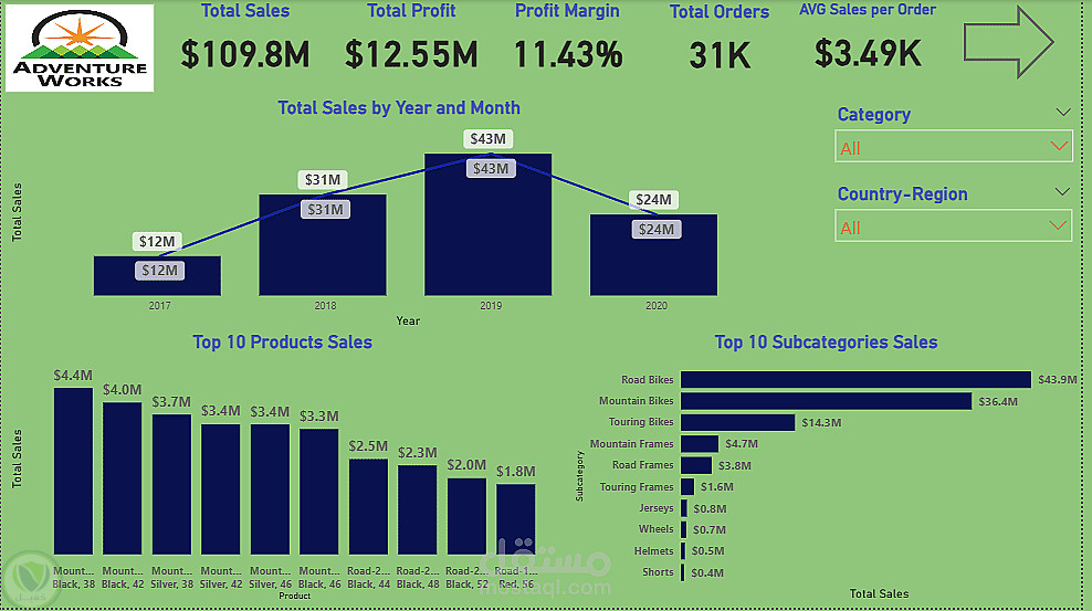 يقدم هذا المشروع لوحة معلومات تفاعلية مبنية باستخدام مجموعة بيانات أدفينشر ووركس لتوفير رؤى حول إجمالي المبيعات والأرباح وأداء المنتج والتحليل الإقليمي.