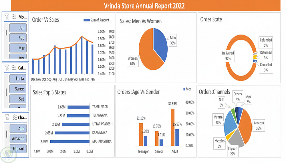 قمتُ بتحليل بيانات مبيعات متجر Vrinda باستخدام برنامج Excel بهدف فهم اتجاهات المبيعات واستخراج مؤشرات الأداء الأساسية. شمل المشروع: