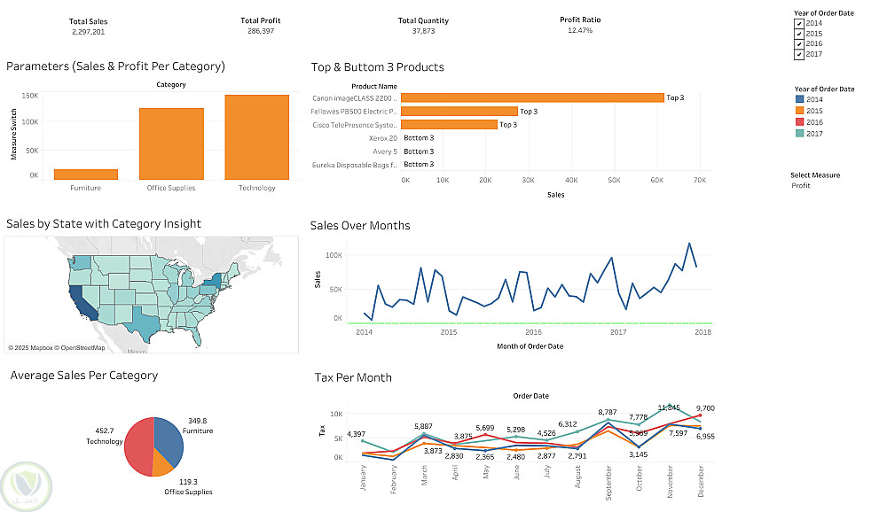 قمت بتصميم لوحة معلومات تفاعلية باستخدام Tableau لعرض وتحليل بيانات المبيعات والأرباح عبر عدة أبعاد.