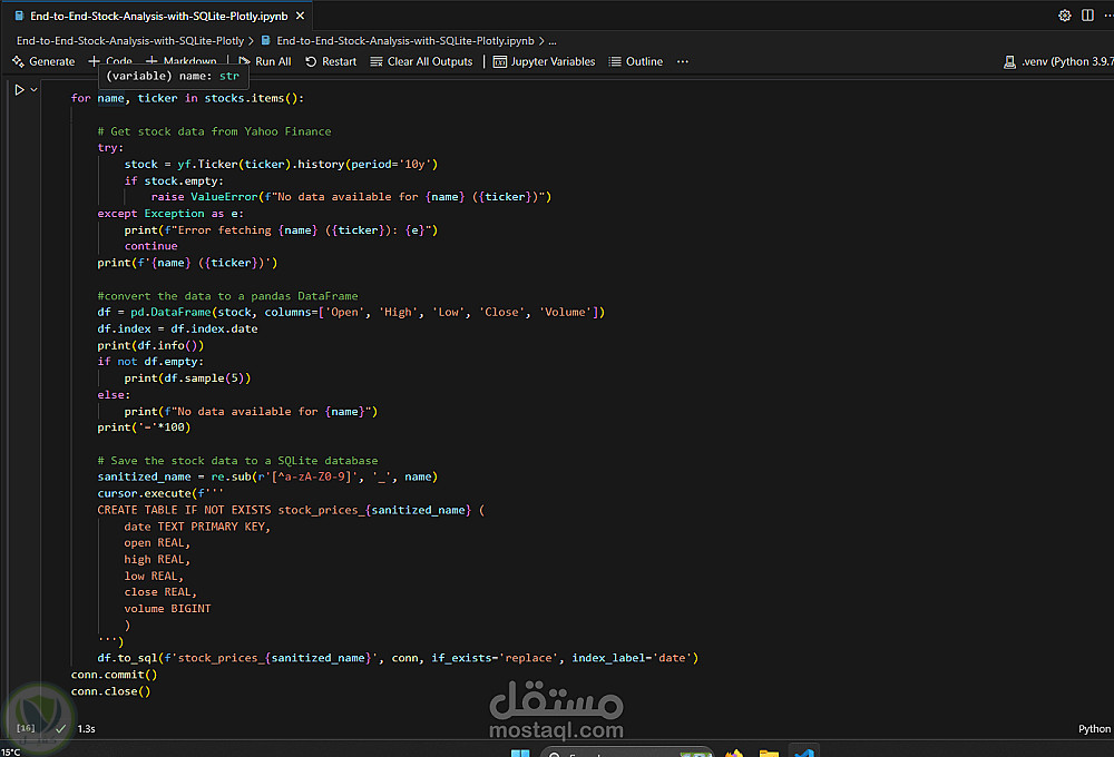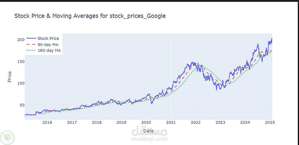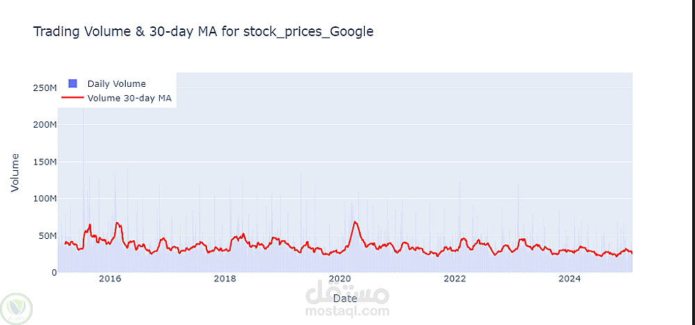 العمل يتضمن جمع وتحليل بيانات الأسهم لشركات مثل جوجل، أمازون، مايكروسوفت، تسلا، وفيسبوك على مدار 10 سنوات باستخدام لغة البرمجة Python. يتم تحميل البيانات من موقع Yahoo Finance وتخزينها في قاعدة بيانات SQLite. بعد ذلك، يتم حساب المتوسطات المتحركة للأسعار وحجم التداول، ثم عرض البيانات في رسوم بيانية تفاعلية باستخدام مكتبة Plotly. الهدف هو تحليل اتجاهات أسعار الأسهم وحجم التداول بمرور الوقت بطريقة مرئية وسهلة الفهم.