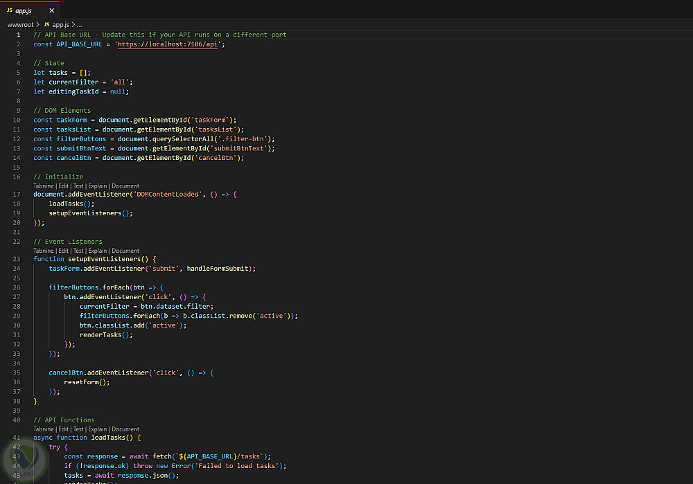 الواجهة مصممة لتكون بسيطة وسلسة في الاستخدام، مع دعم فلترة المهام حسب الحالة (الكل، النشطة، المكتملة)، ويتم تحديث البيانات بشكل فوري من خلال الاتصال بـ RESTful API خاص بالخادم الخلفي.