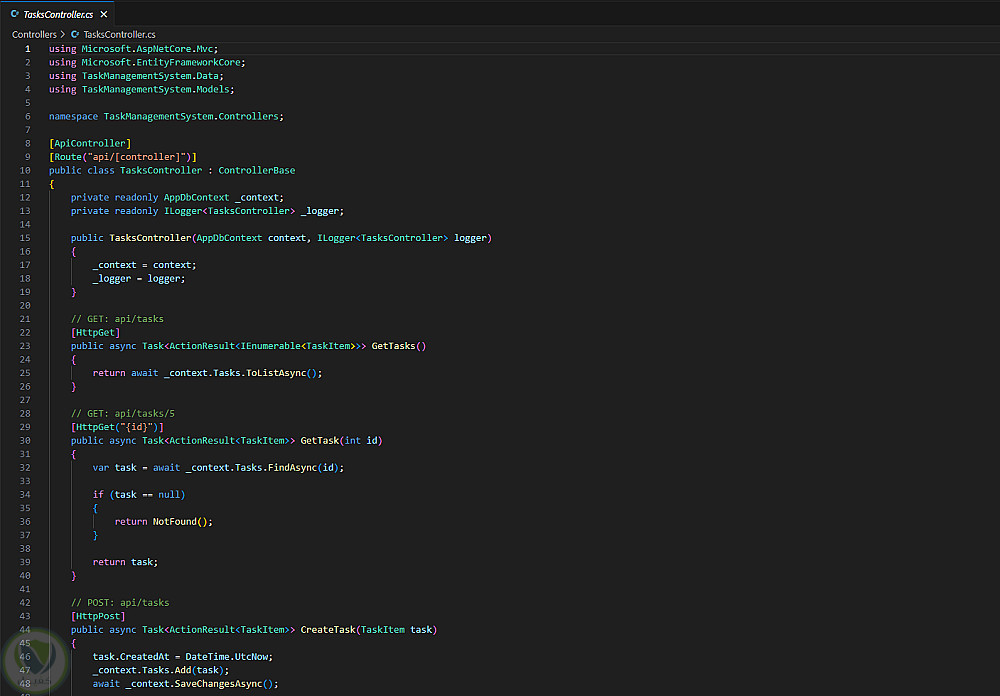 مشروع نظام إدارة مهام (Task Management System) تم تطويره باستخدام ASP.NET Core Web API وEntity Framework Core.