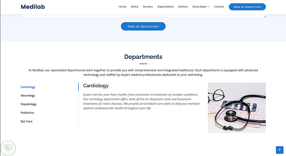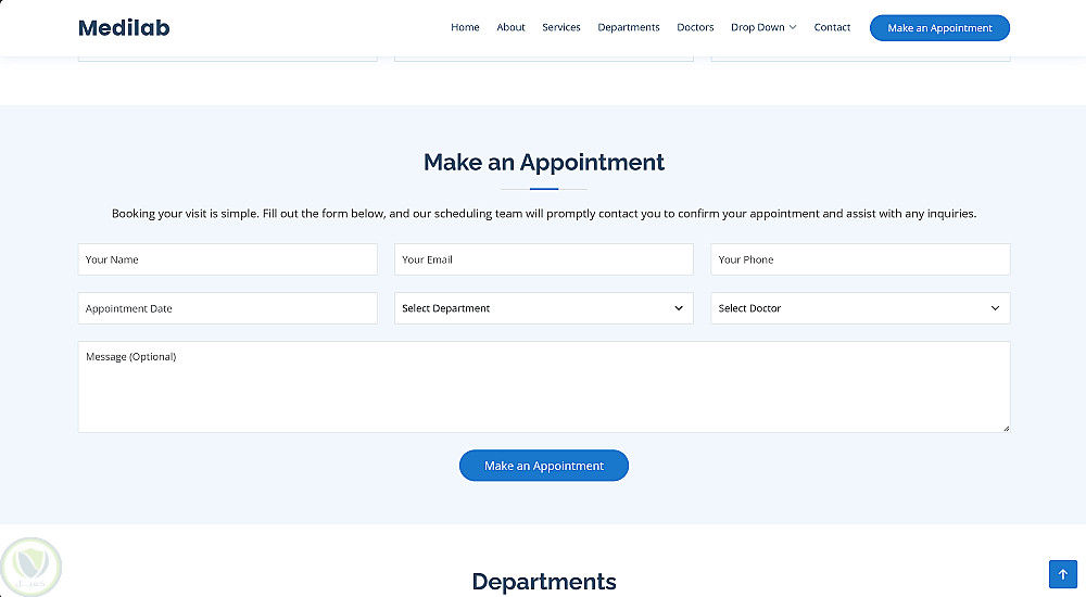 شريط تنقل علوي (Home, About, Services, Departments, Doctors, Drop Down, Contact, Make an Appointment).