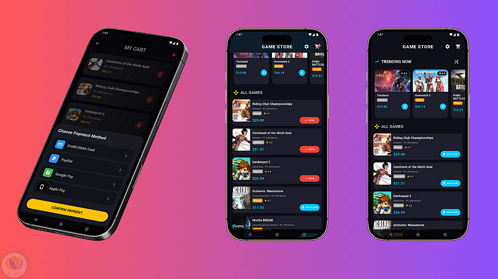 تطبيق حديث وسهل الاستخدام يتيح للمستخدمين تصفح واستكشاف وشراء ألعابهم المفضلة بسهولة. يحتوي على قسم للألعاب الرائجة، وقوائم تفصيلية بالأسعار والتقييمات، مع تجربة تسوق سلسة وسلة مشتريات وخطوات دفع آمنة.